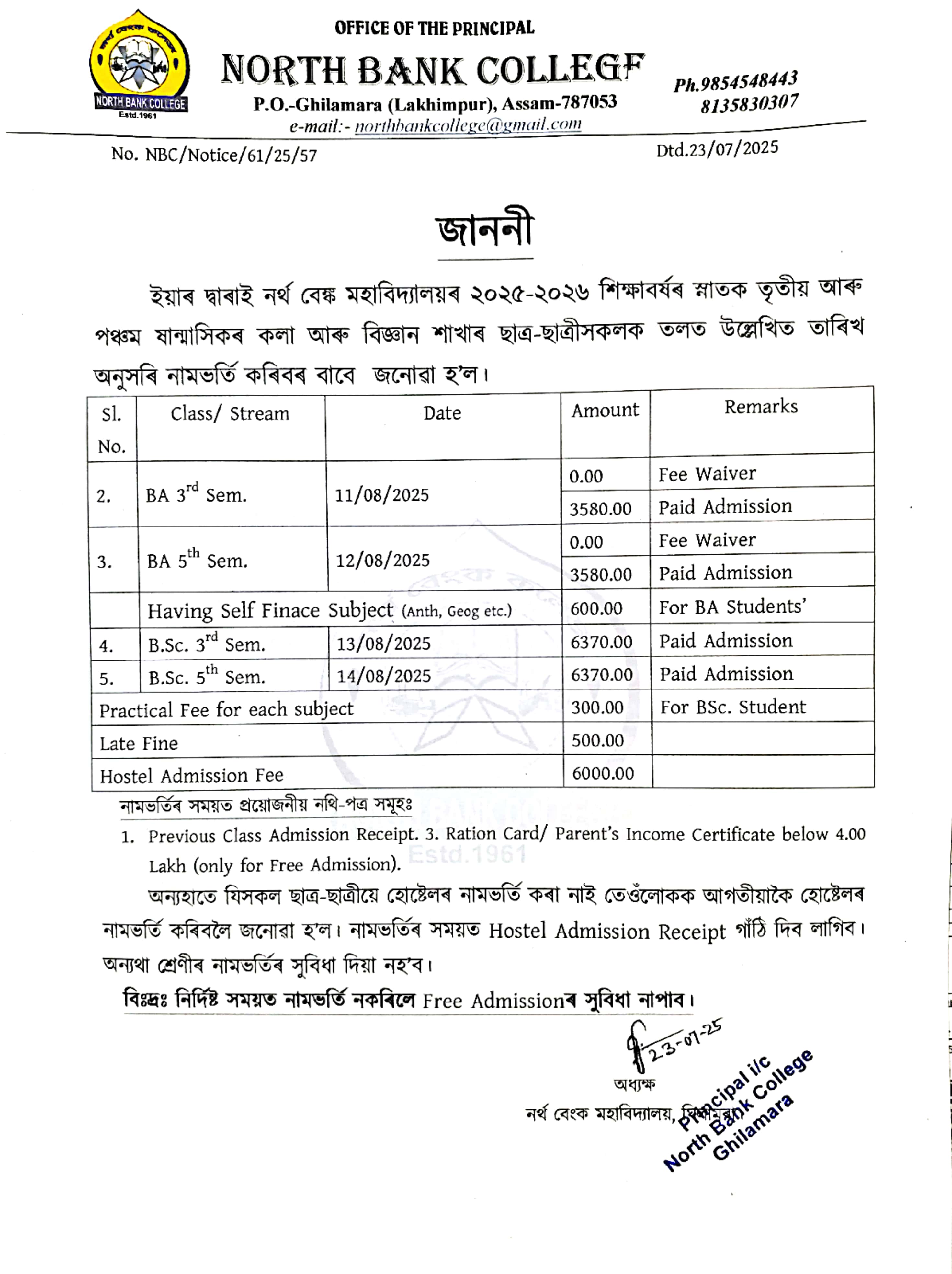 North Bank College, the second oldest institution of higher education in the undivided Lakhimpur District of Assam was established in 1961 in between two rivers, the Brahmaputra and the Subansiri by the entire people of the north bank of the river Brahmaputra. The College was initially affiliated to Gauhati University in 1964 as the co-educational institution but the affiliation was shifted to Dibrugarh University just after its establishment in the year 1965 and brought under the deficit system of Grant-in-aid in the year 1972.