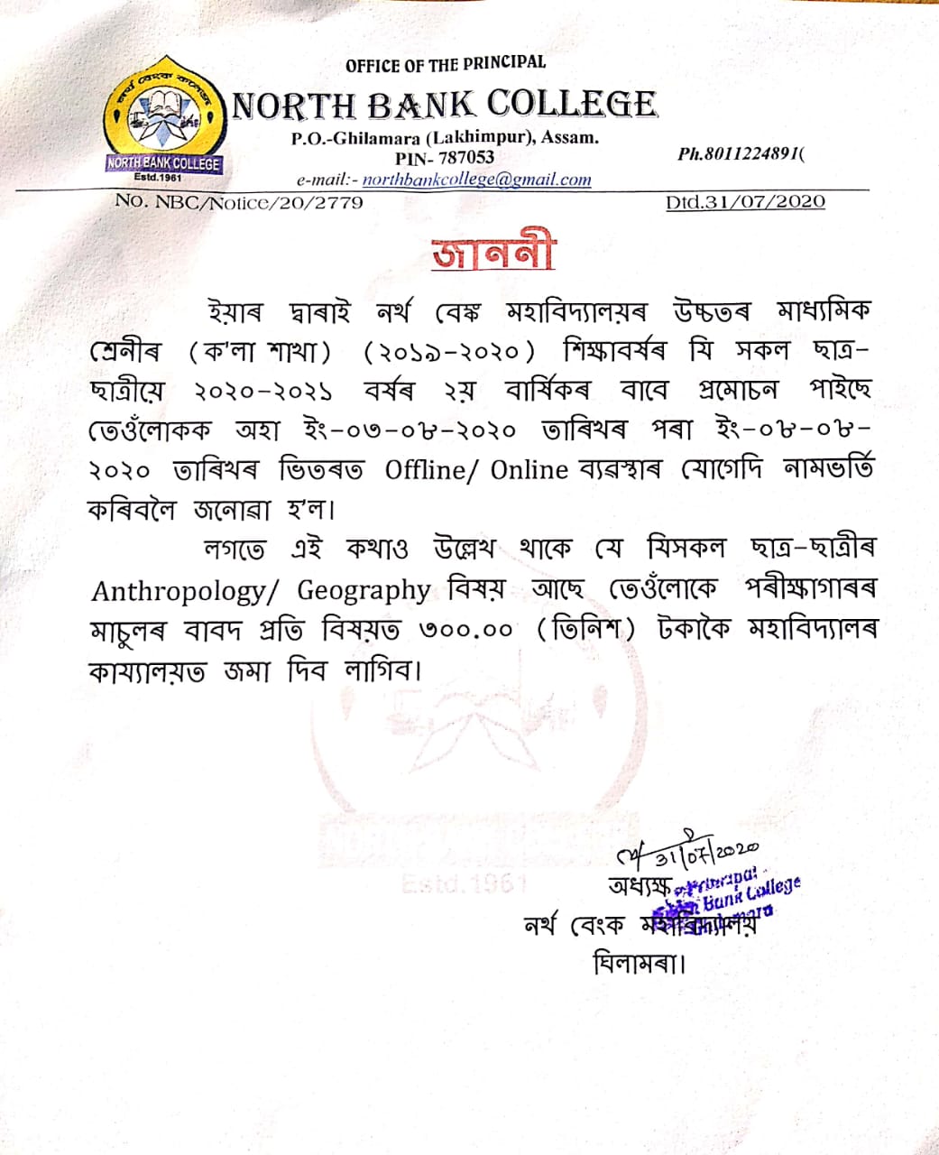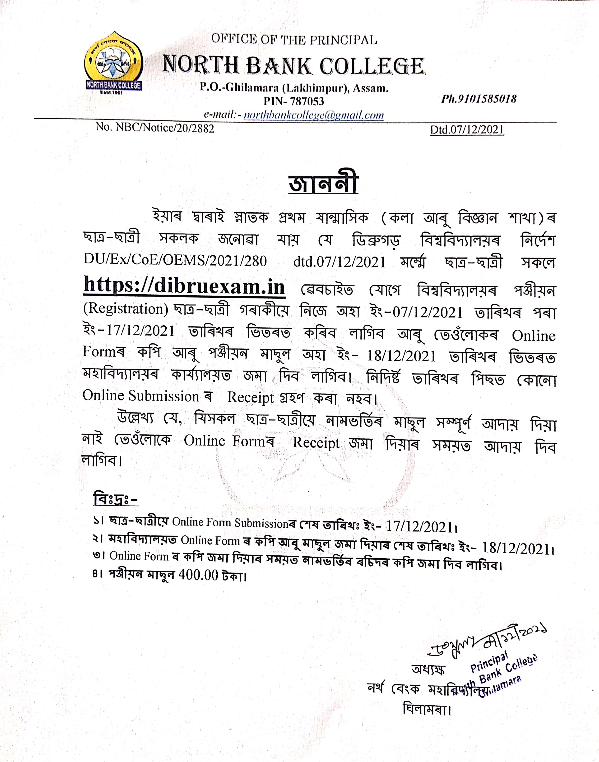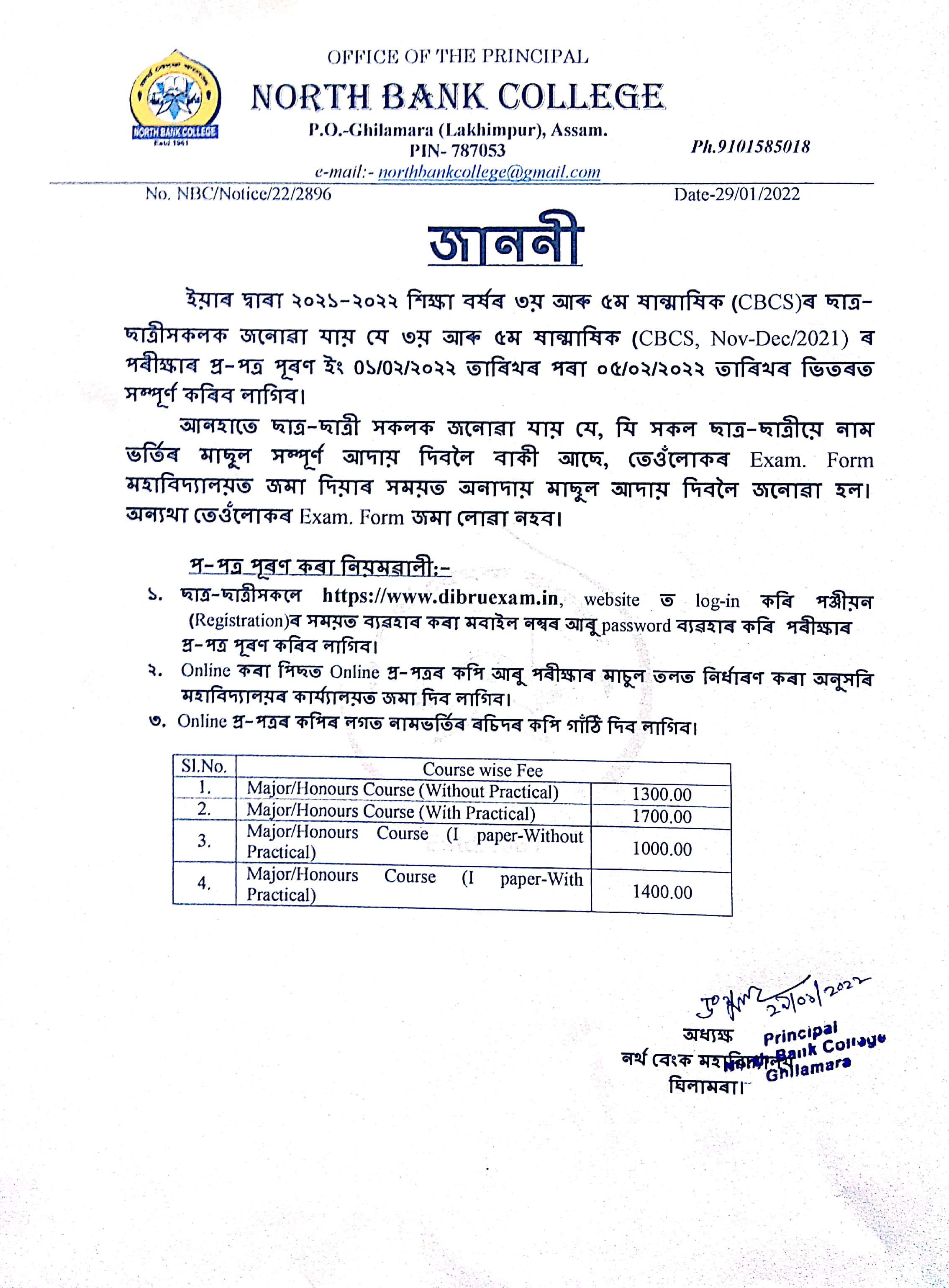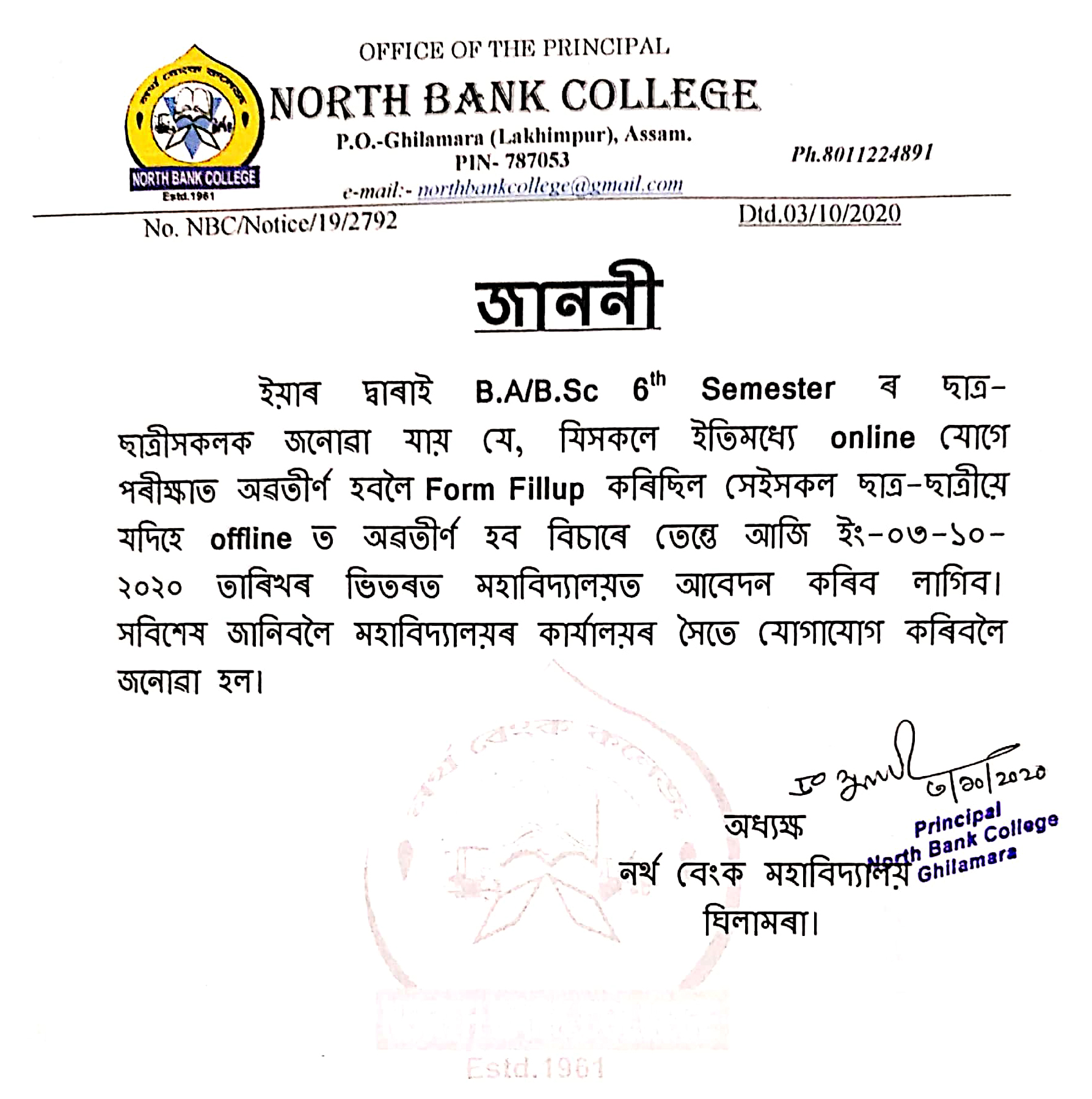 Exam. Form Fillup Notice for 1st, 3rd and 5th Sem (Non CBCS) 2020
