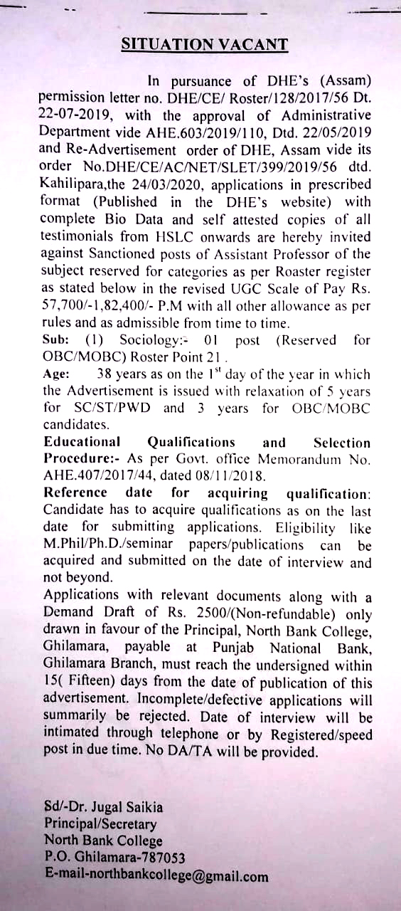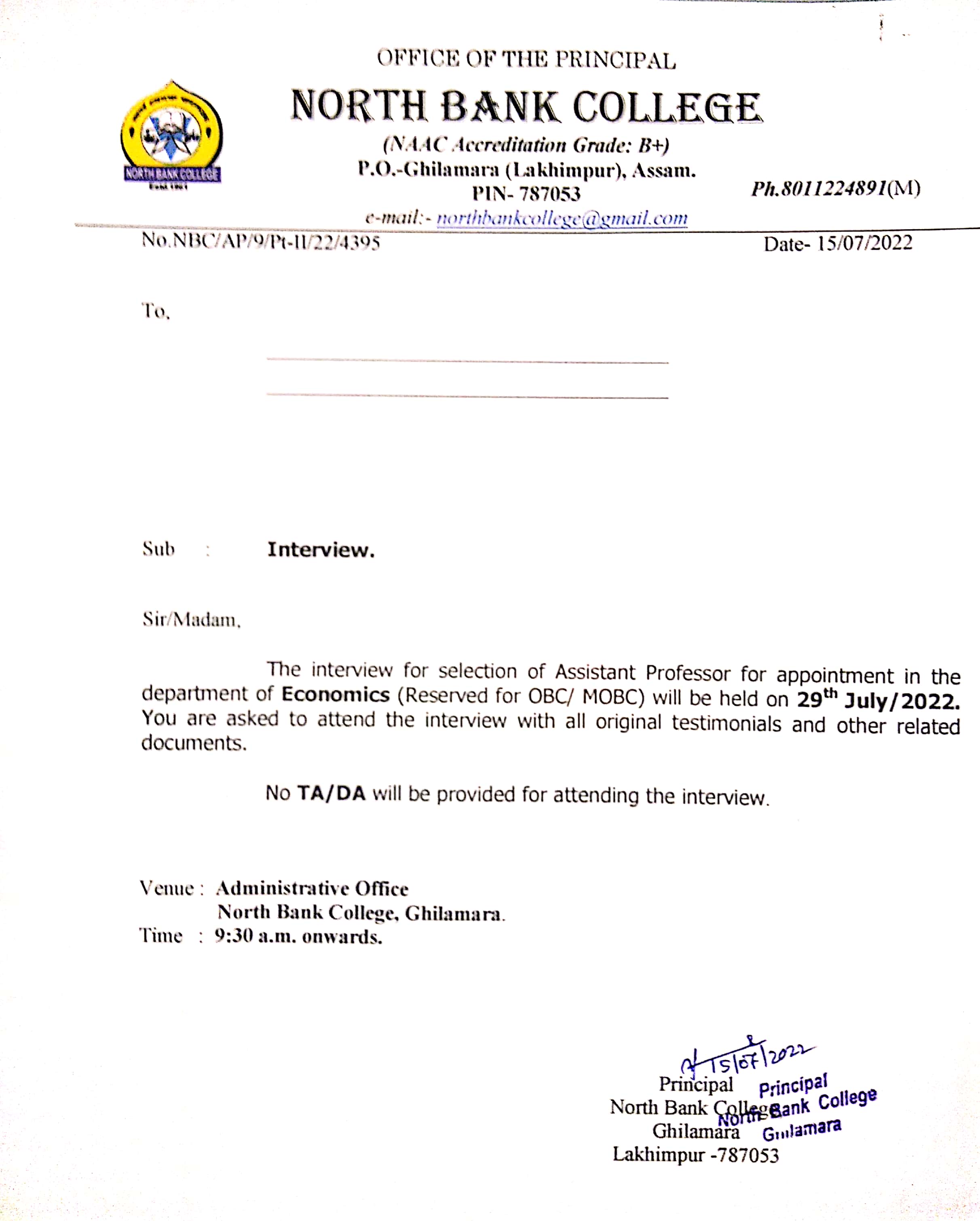 Call Letter to the Candidate(s) for Selection of Asstt. Prof, Interview, Sociology Deptt.