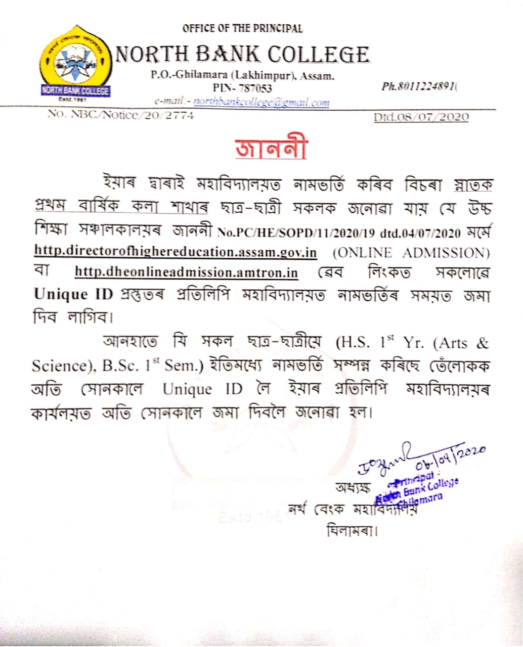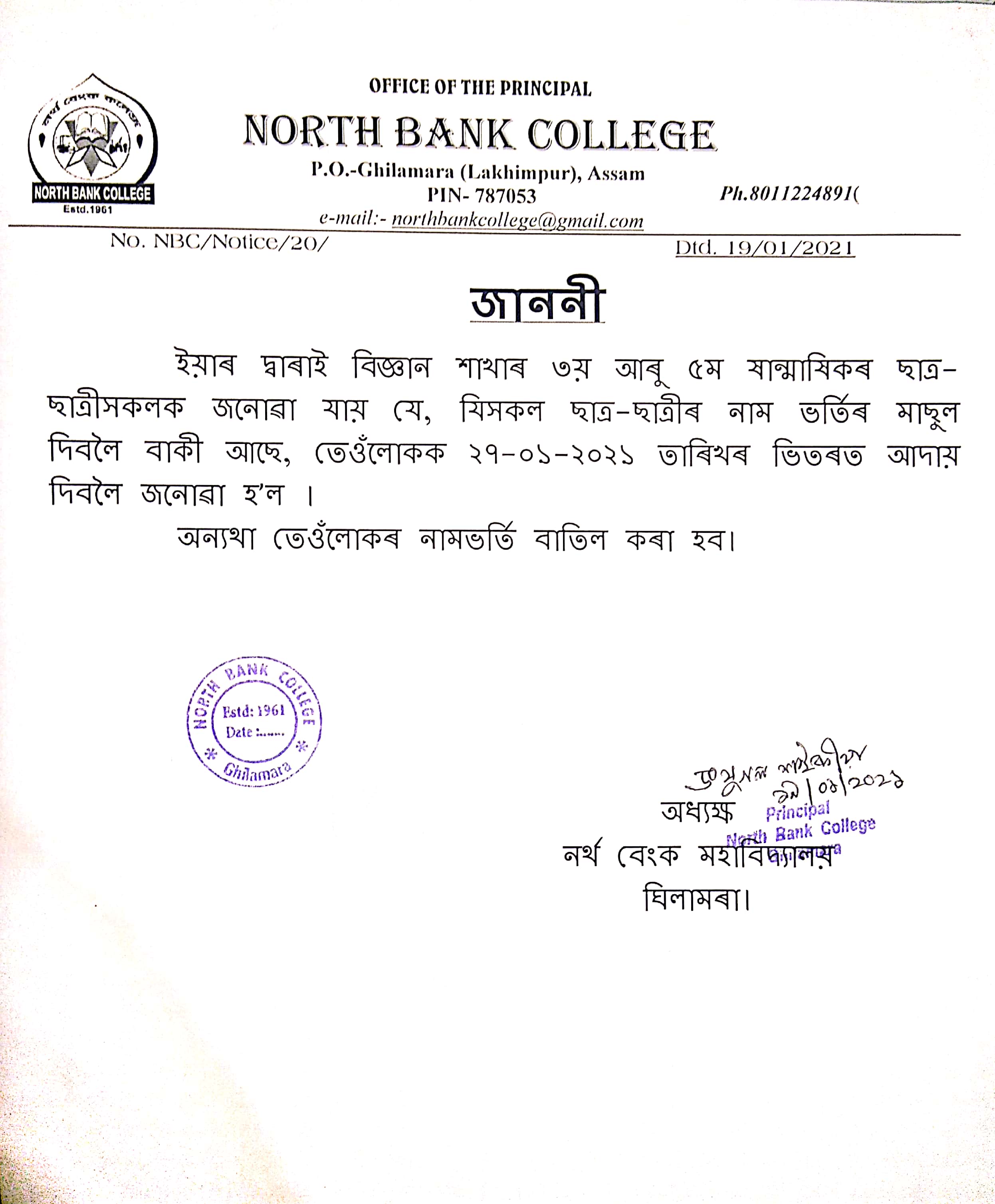 Notification for Complete of Admission Fee of B.Sc. 1st Sem.-2020
