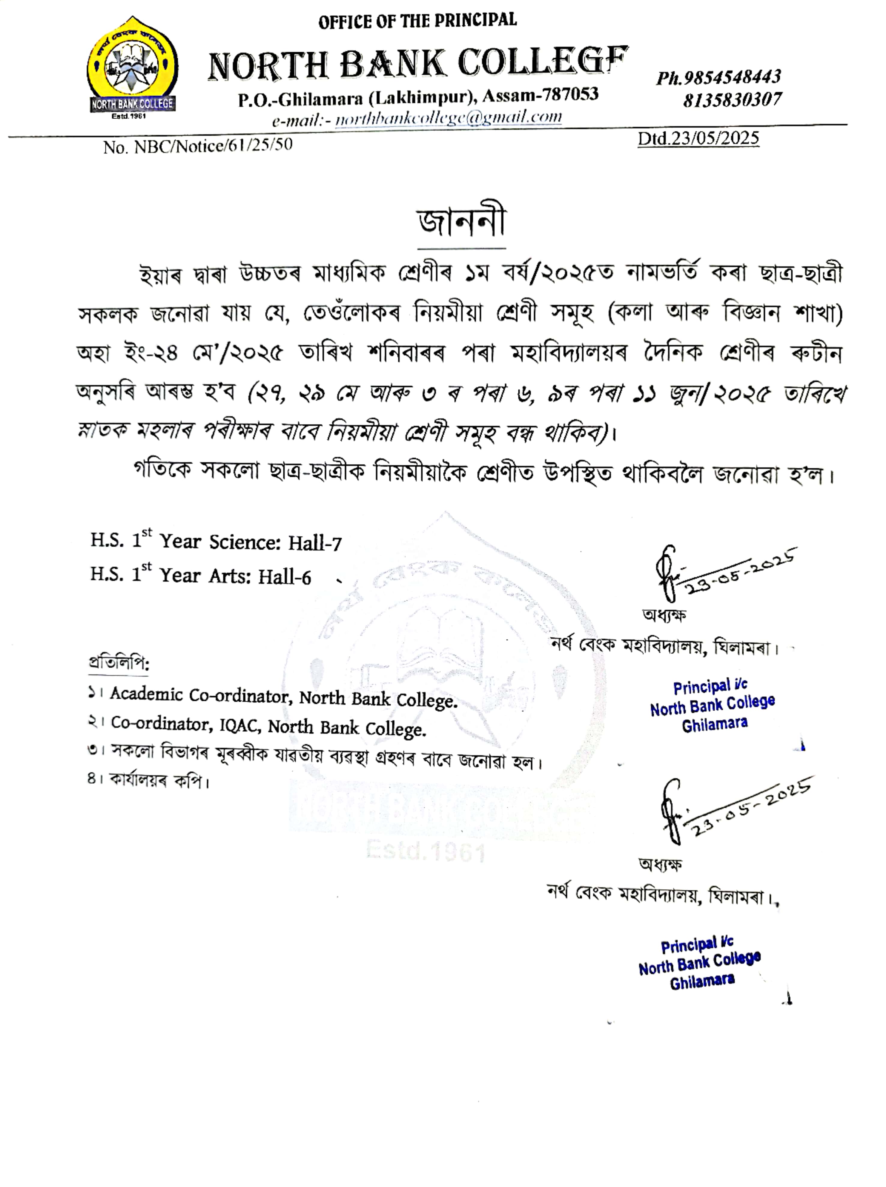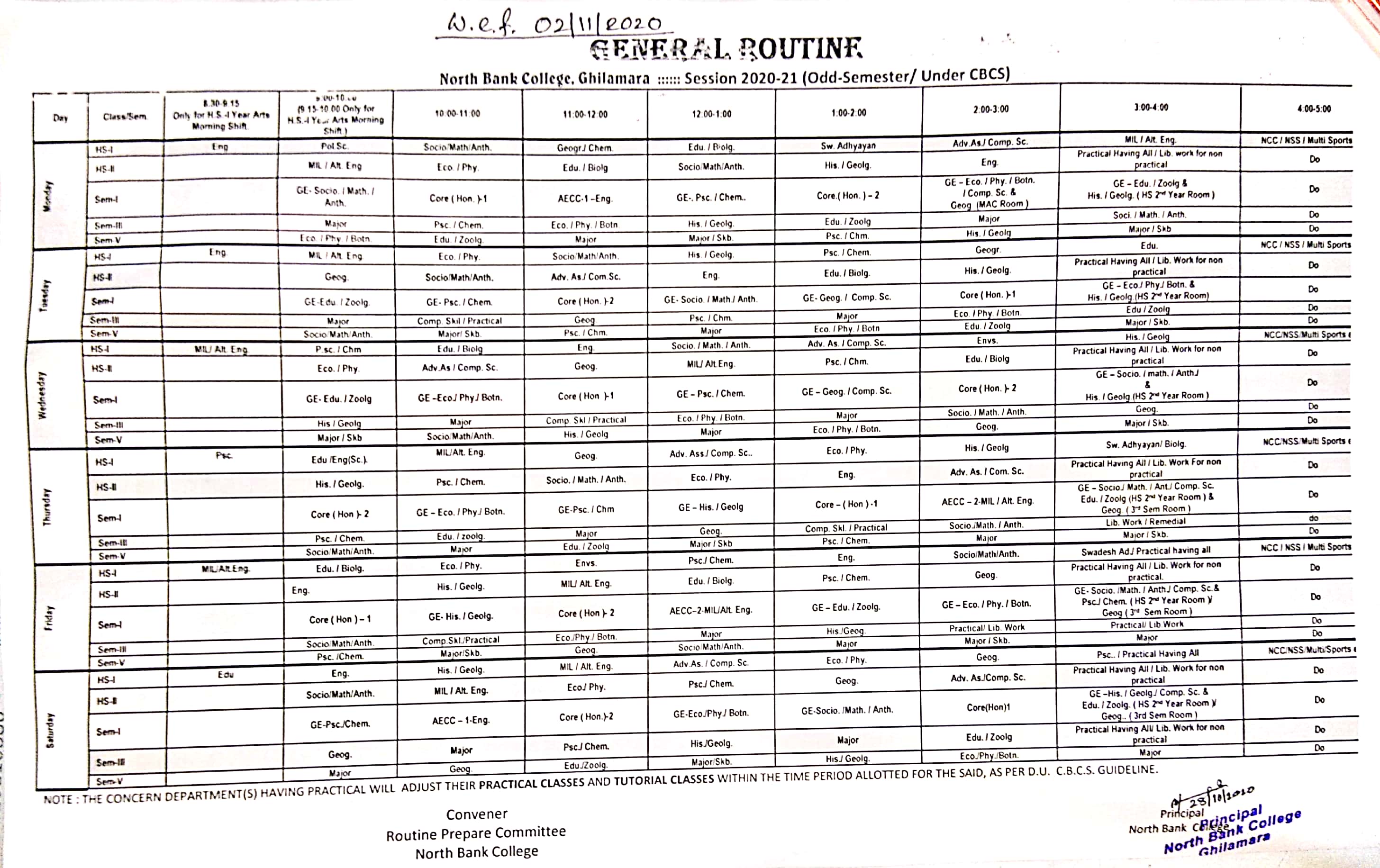 Daily Class Routine-2025 of HS and FYUGP (Odd Sem)
