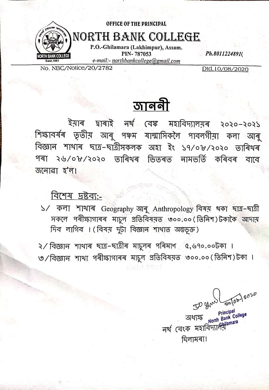 Admission Notice for 3rd and 5th Sem BA & BSc