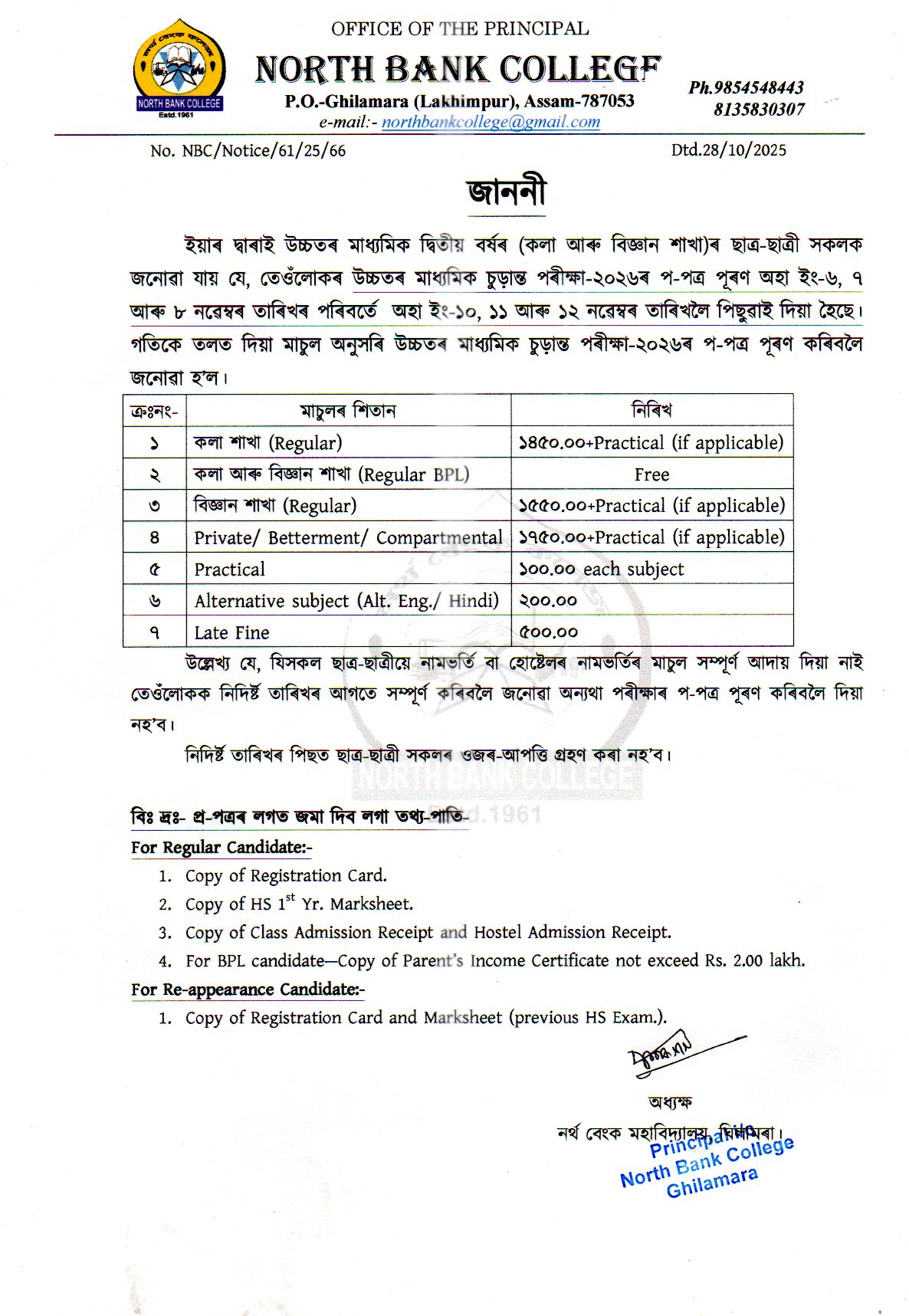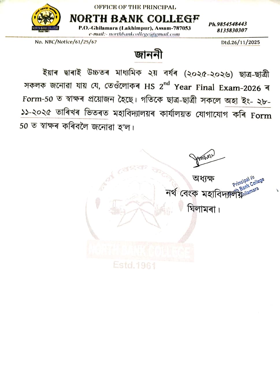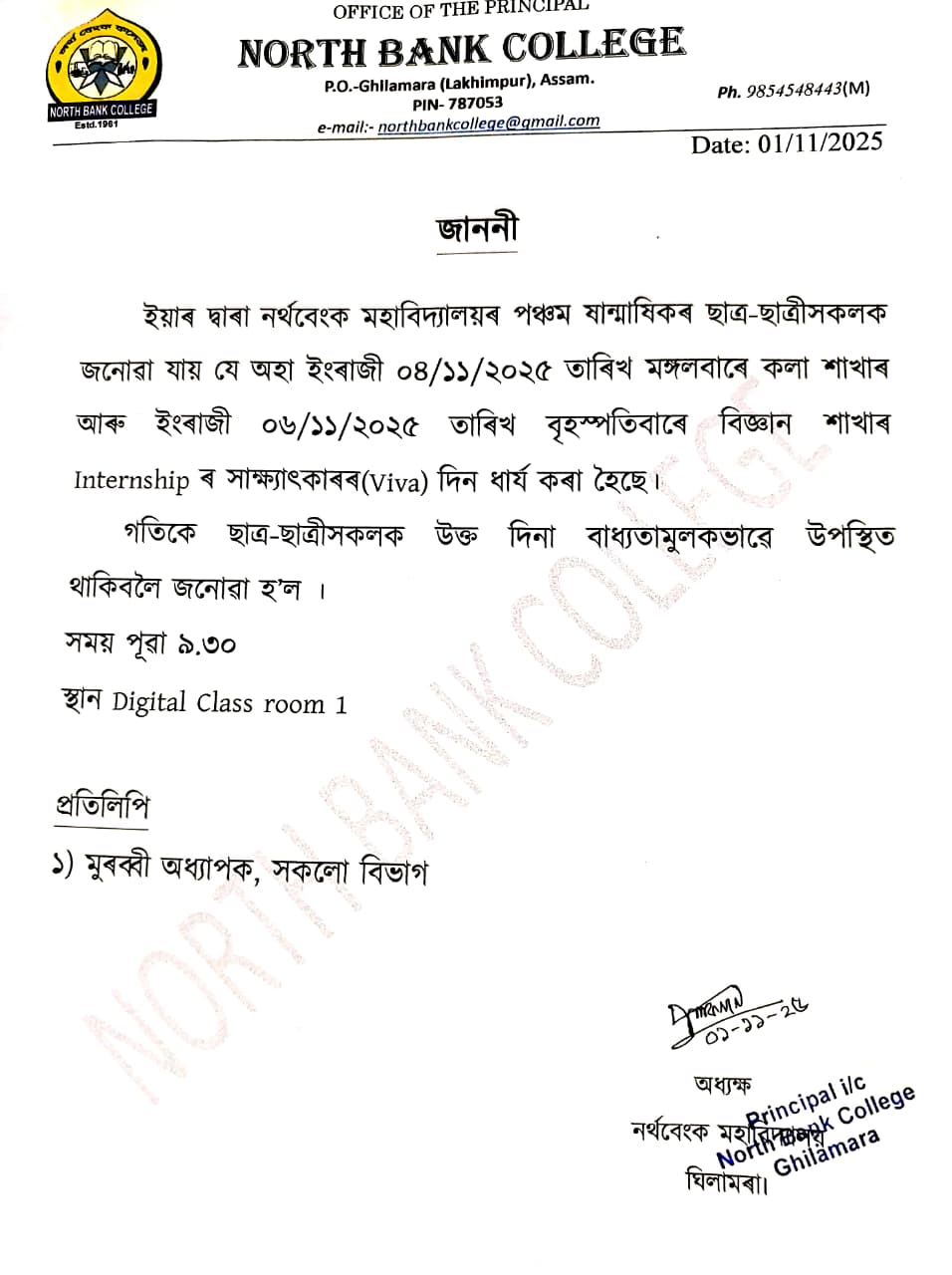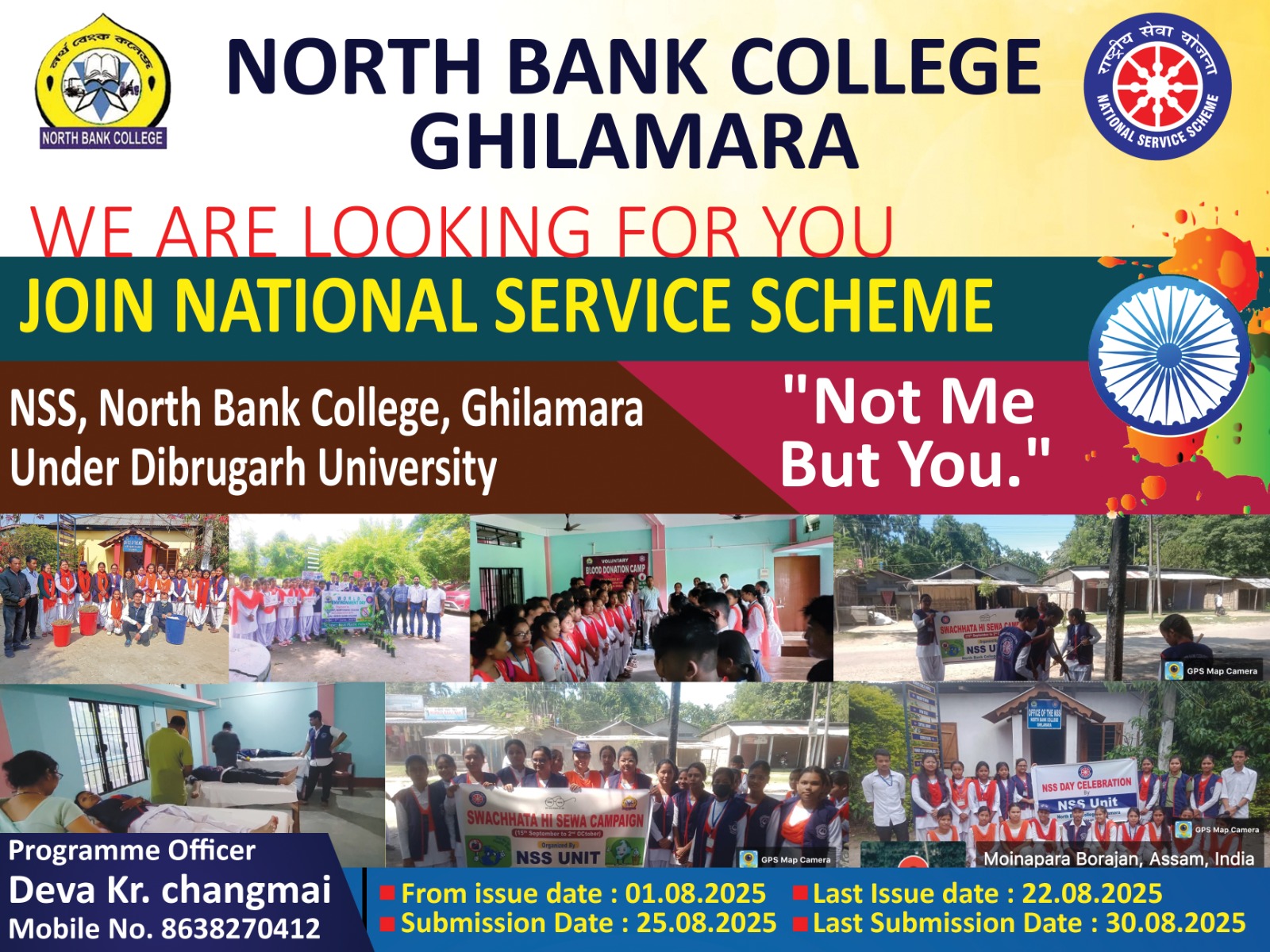 North Bank College, the second oldest institution of higher education in the undivided Lakhimpur District of Assam was established in 1961 in between two rivers, the Brahmaputra and the Subansiri by the entire people of the north bank of the river Brahmaputra. The College was initially affiliated to Gauhati University in 1964 as the co-educational institution but the affiliation was shifted to Dibrugarh University just after its establishment in the year 1965 and brought under the deficit system of Grant-in-aid in the year 1972.