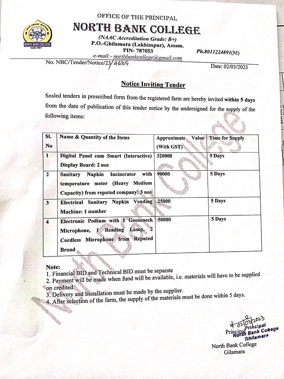 Since the very inception, North Bank College has been rendering higher education to the ambitious youths of this backward area and facilitating for their present livelihood which would otherwise have been a far cry. However the College is highly greatfull to Late Lalit Ch. Doley, the founder President and Late Satish Ch. Gogoi, the founder Secretary of the Governing Body, for offering this opportunity for getting higher education in the locality...
