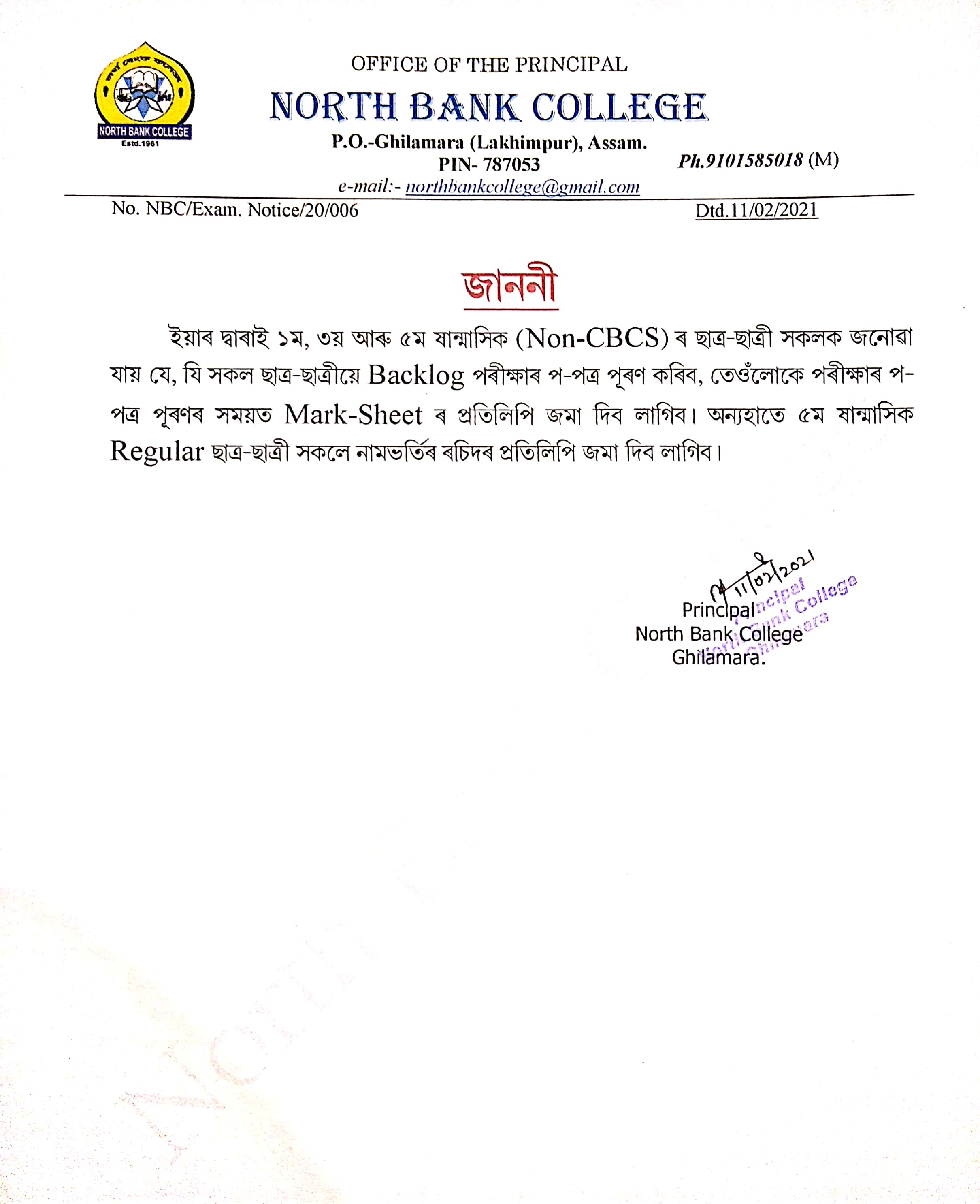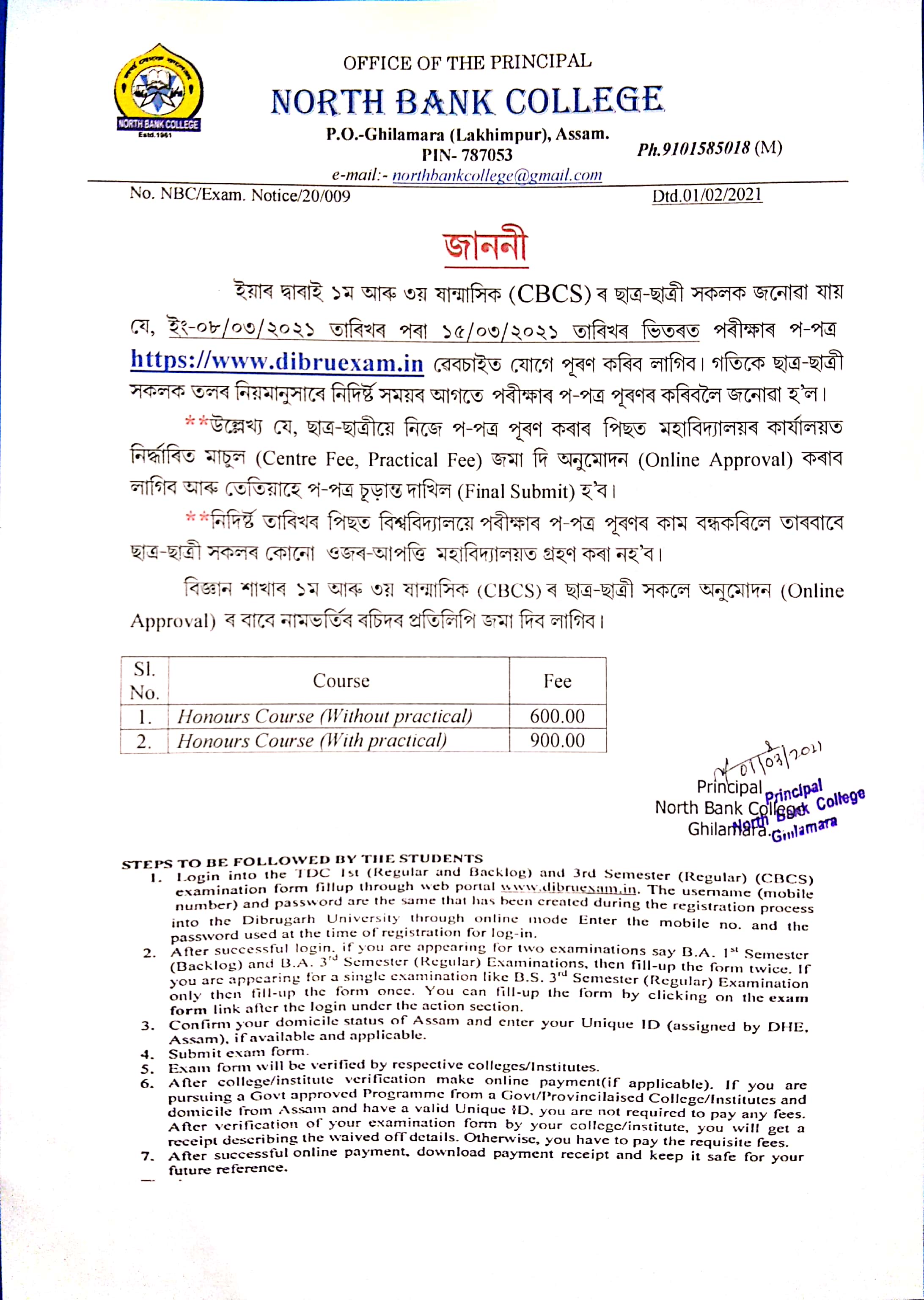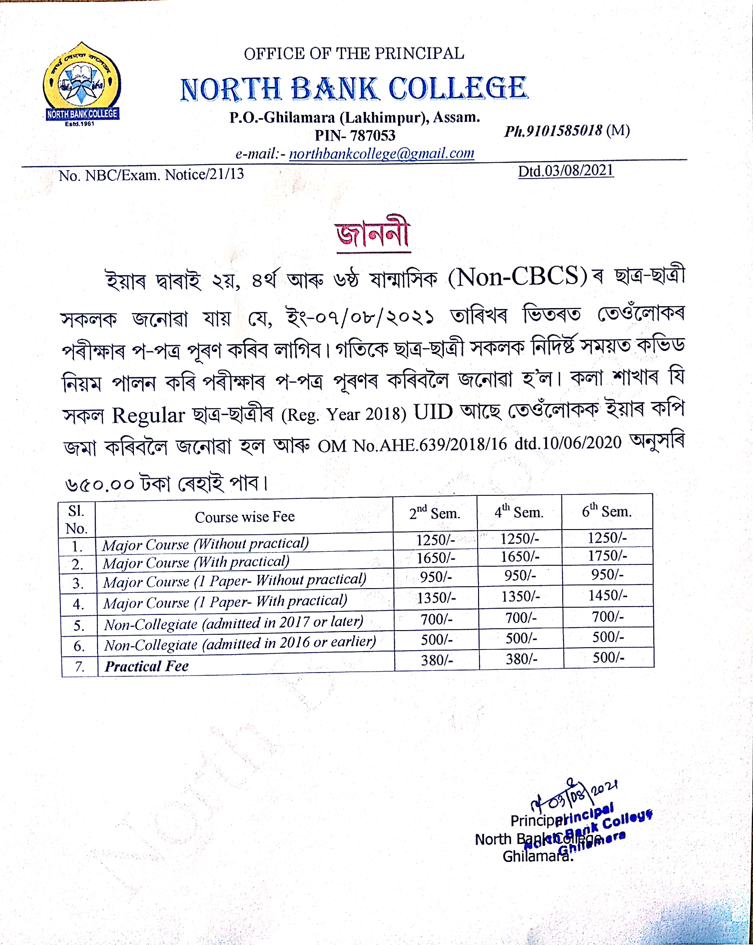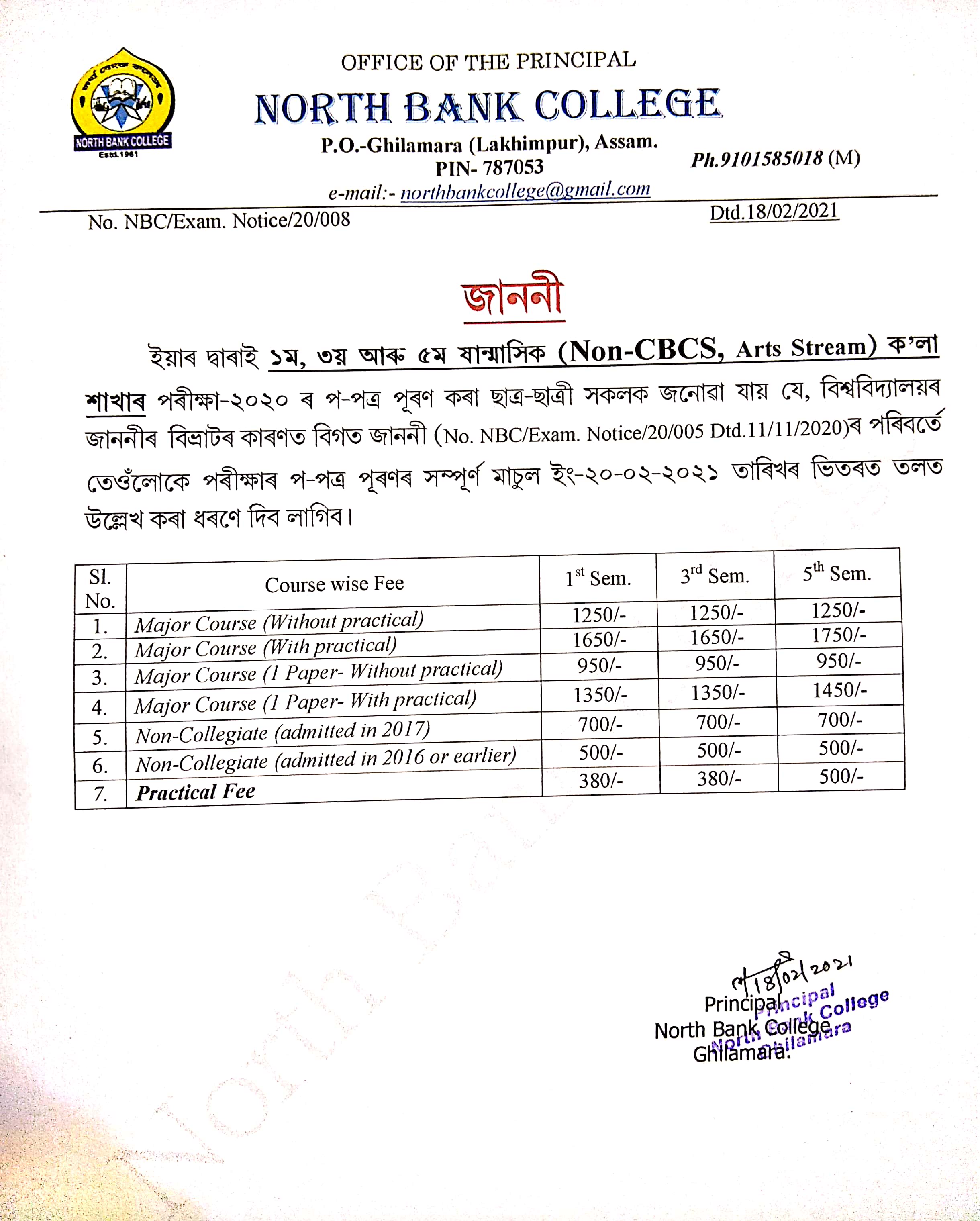 Exam. Form Fillup Notice for 1st, 3rd and 5th Sem (Non CBCS) 2020