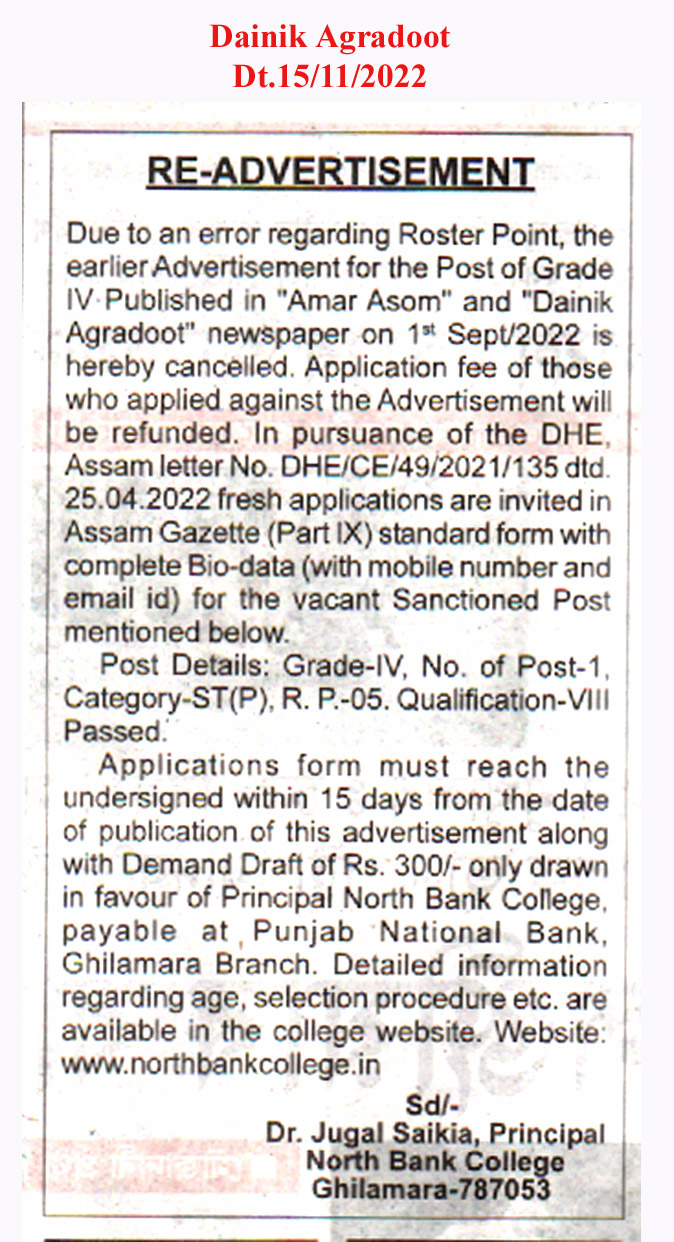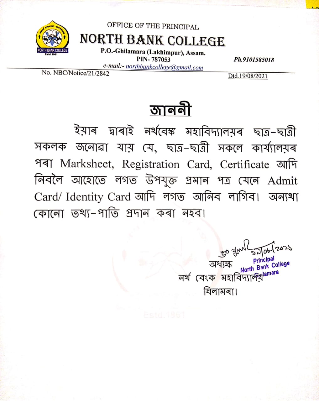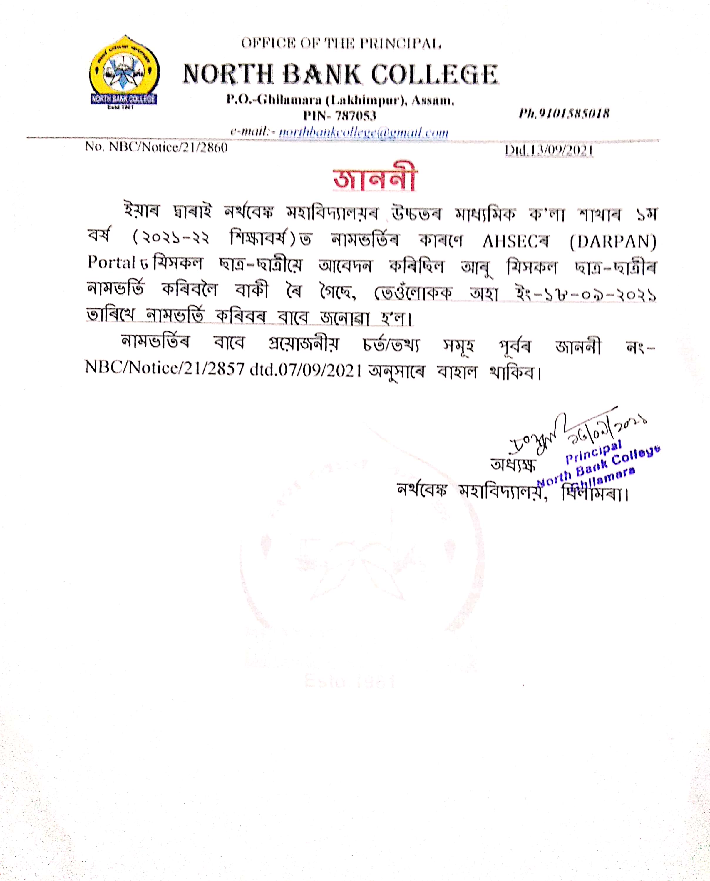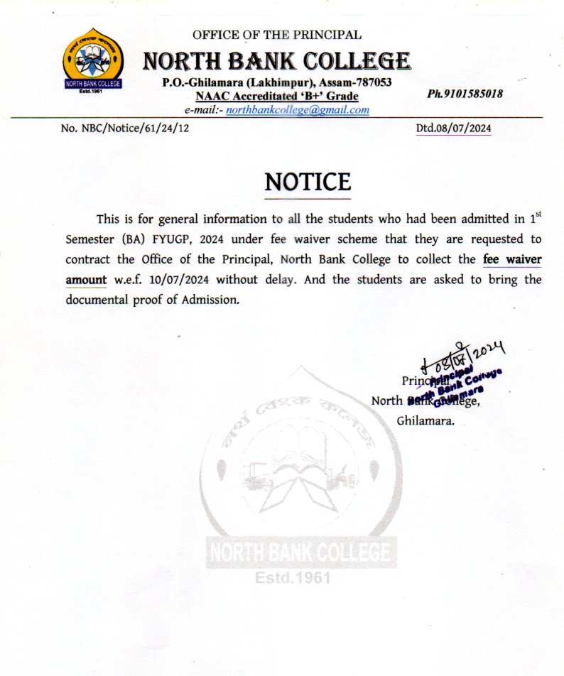 Notification for Complete of Admission Fee of B.Sc. 1st Sem.-2020
